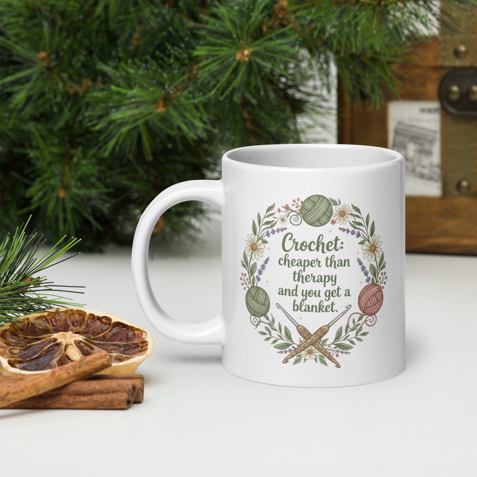 If laughter is the best medicine, crochet is definitely the co-pay. This “Crochet: Cheaper Than Therapy and You Get a Blanket” white glossy mug is the perfect funny, light-hearted gift for anyone who uses yarn as a coping mechanism and calls it “self-care.”