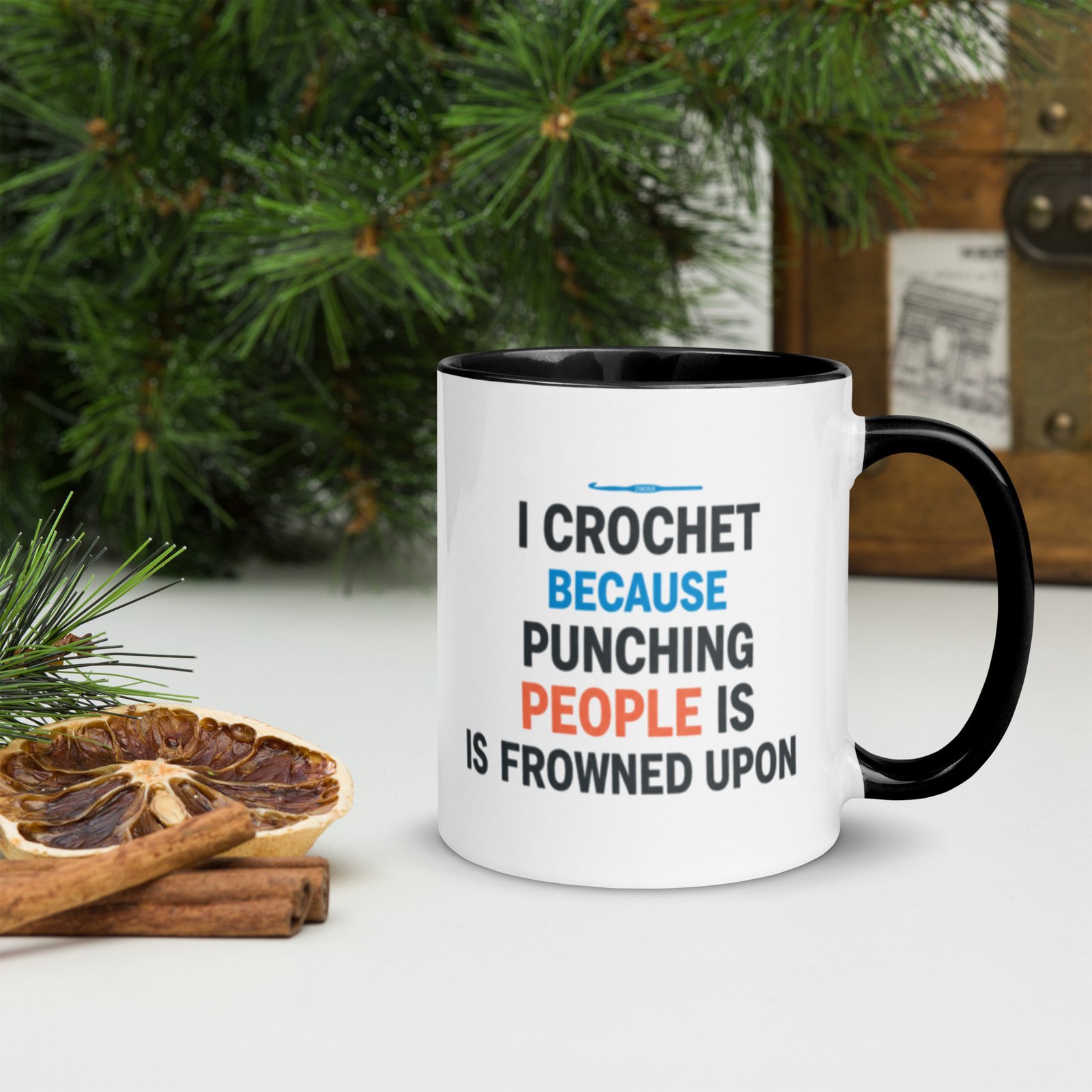 Stir in some snark with this bold “I Crochet Because Punching People Is Frowned Upon” mug. A perfect pick‑me‑up for crocheters with a sense of humor, it features a clean, modern type layout with playful color pops and a crochet hook accent. Great for home, studio, or the office—and guaranteed to get a laugh at craft night.