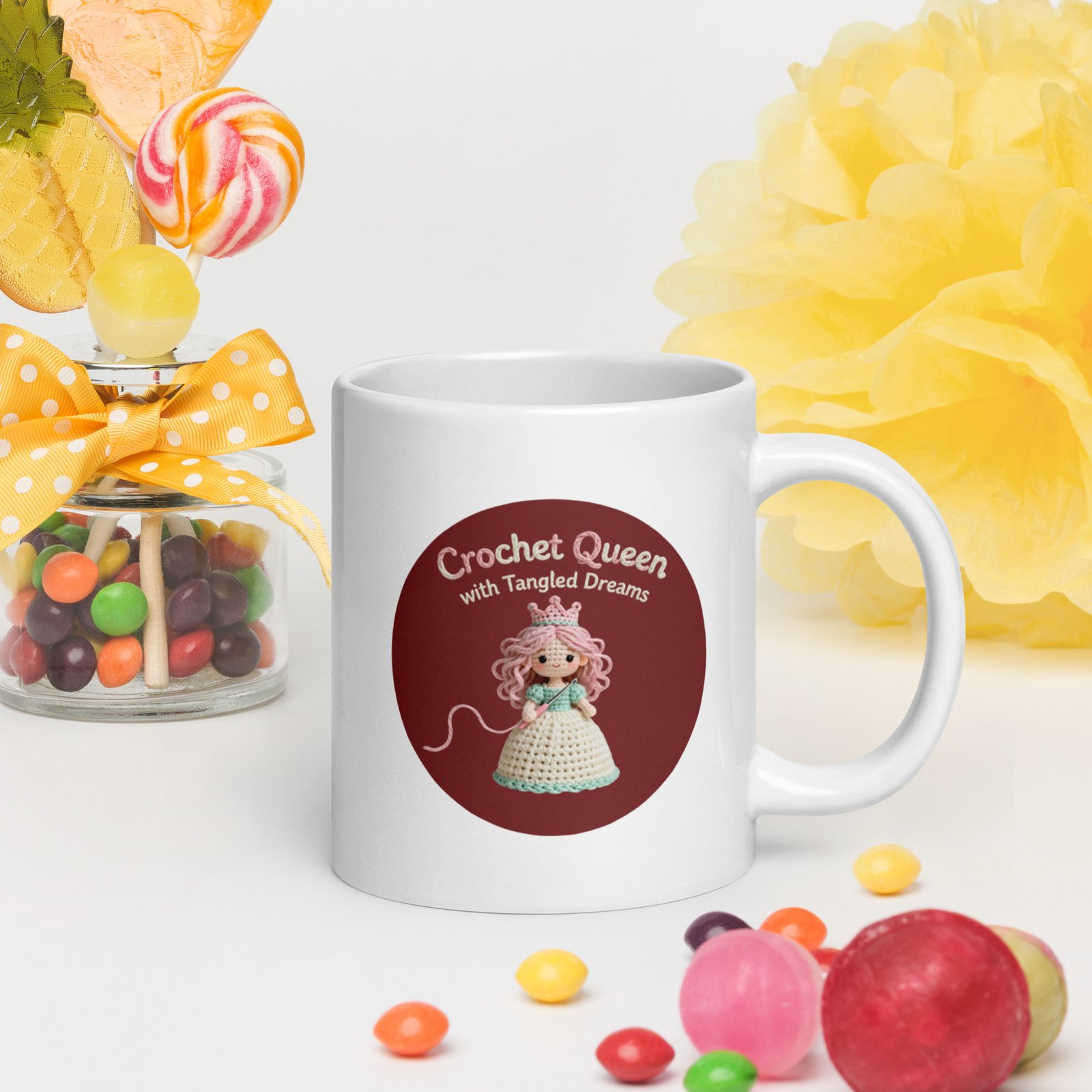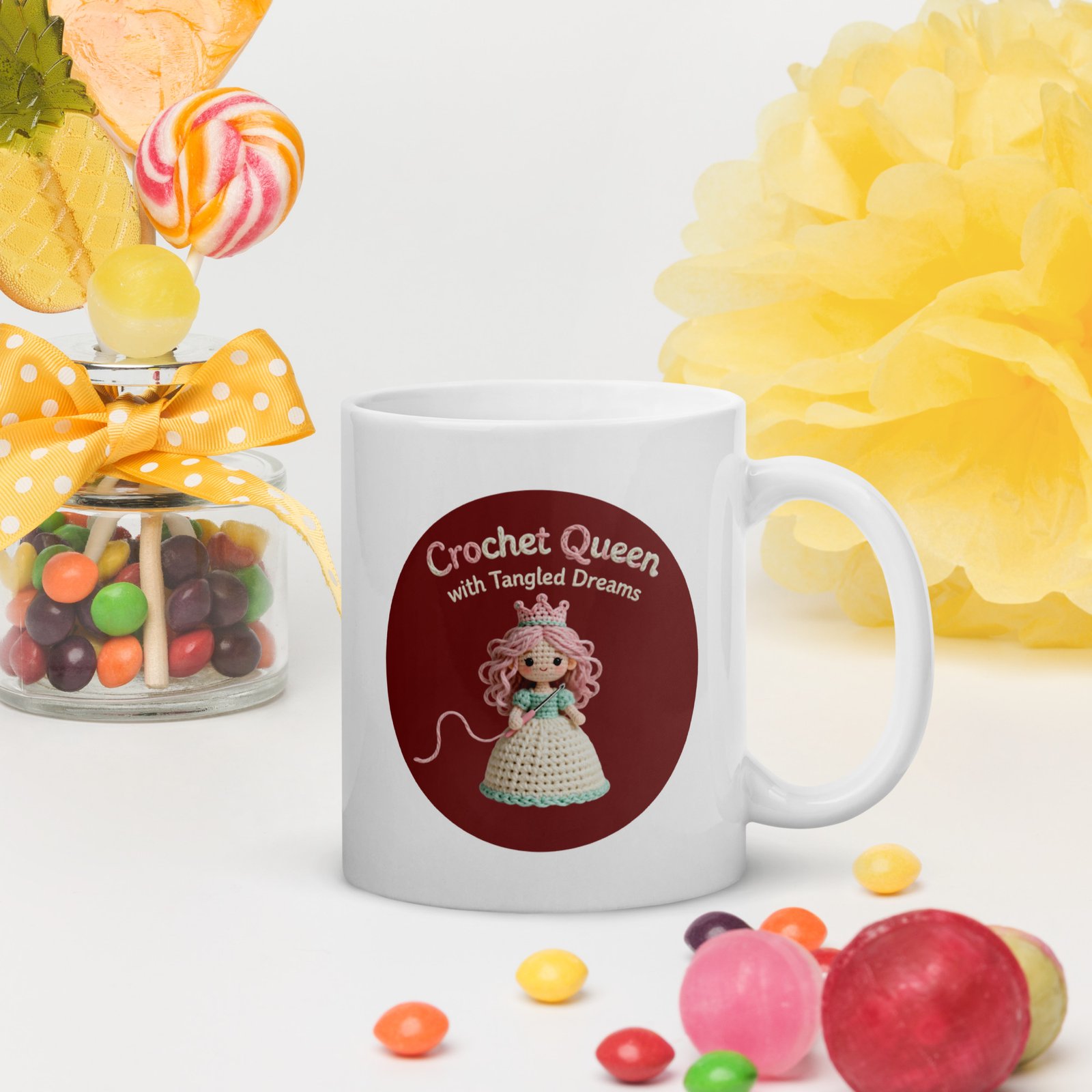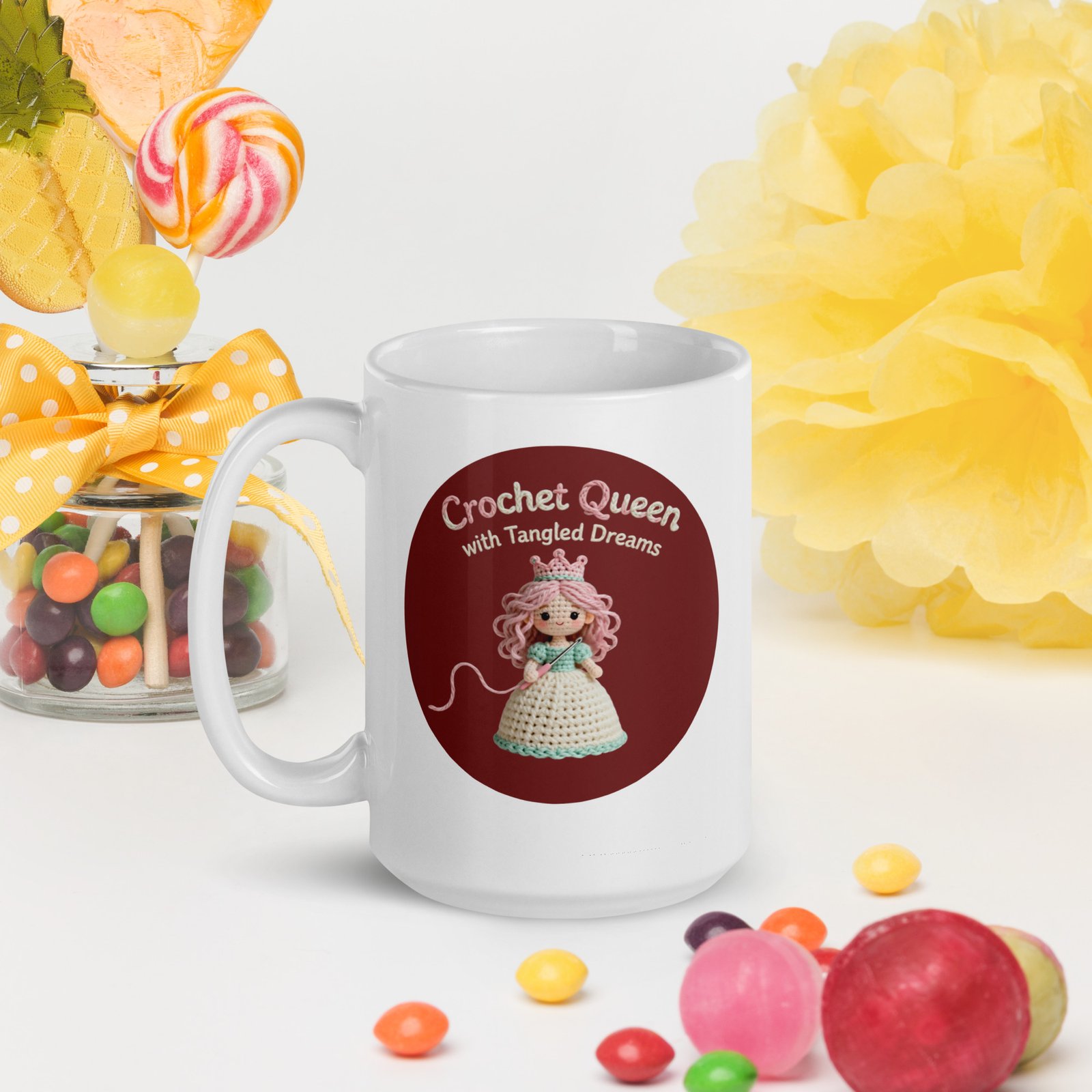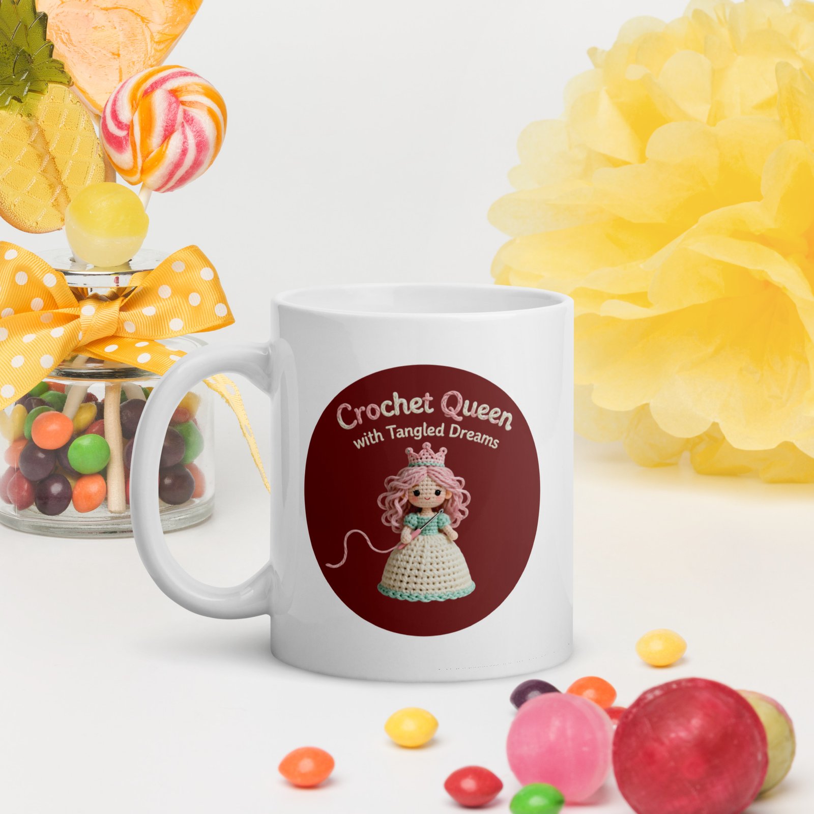 Every queen deserves a throne… and a proper royal coffee. The “Crochet Queen with Tangled Dreams” white glossy mug turns your everyday caffeine routine into a cozy morning coronation.