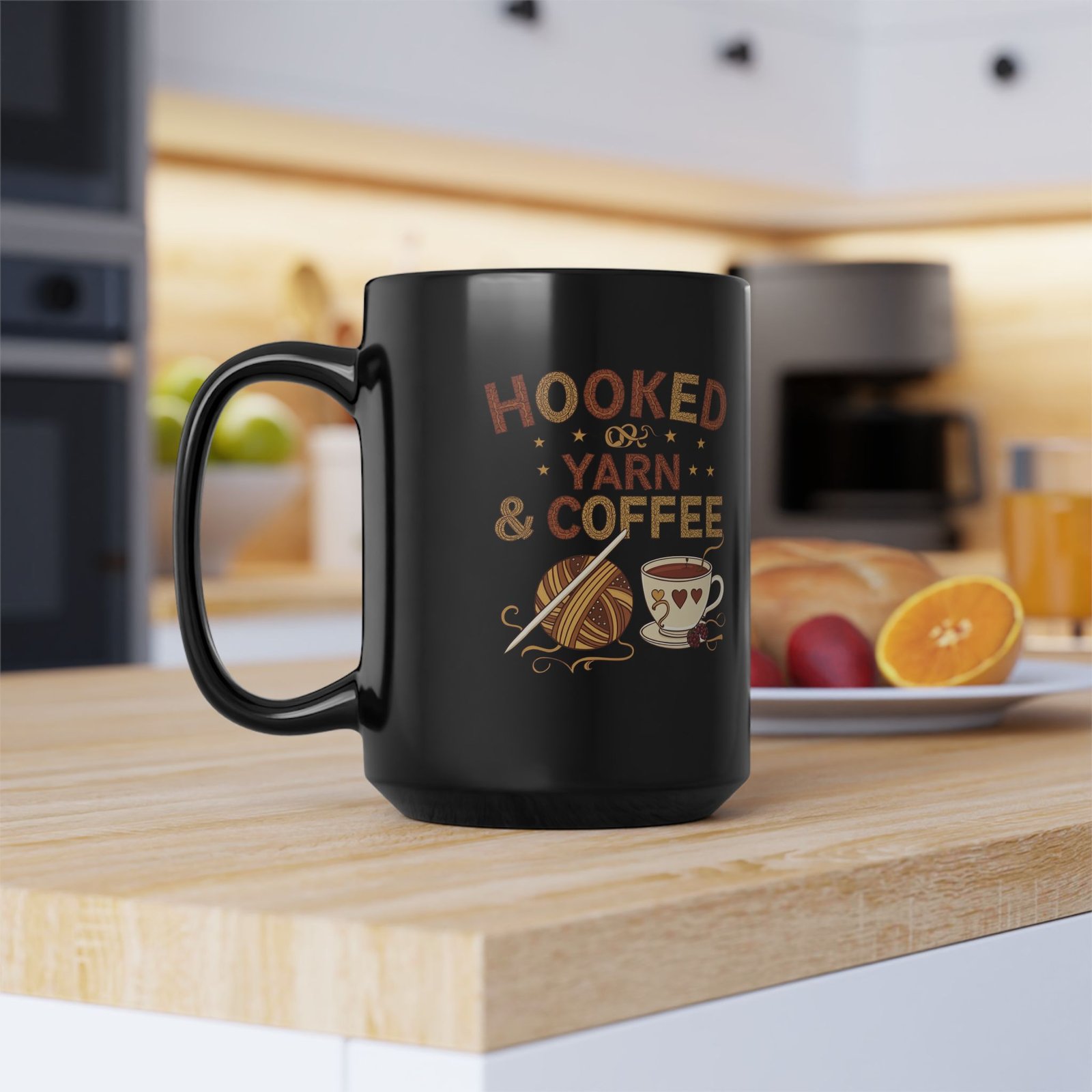 “Hooked on Yarn and Coffee” Mug – Funny Crochet Quote Cup for Yarn Lovers – Black Glossy Mug — (11oz/15oz)
